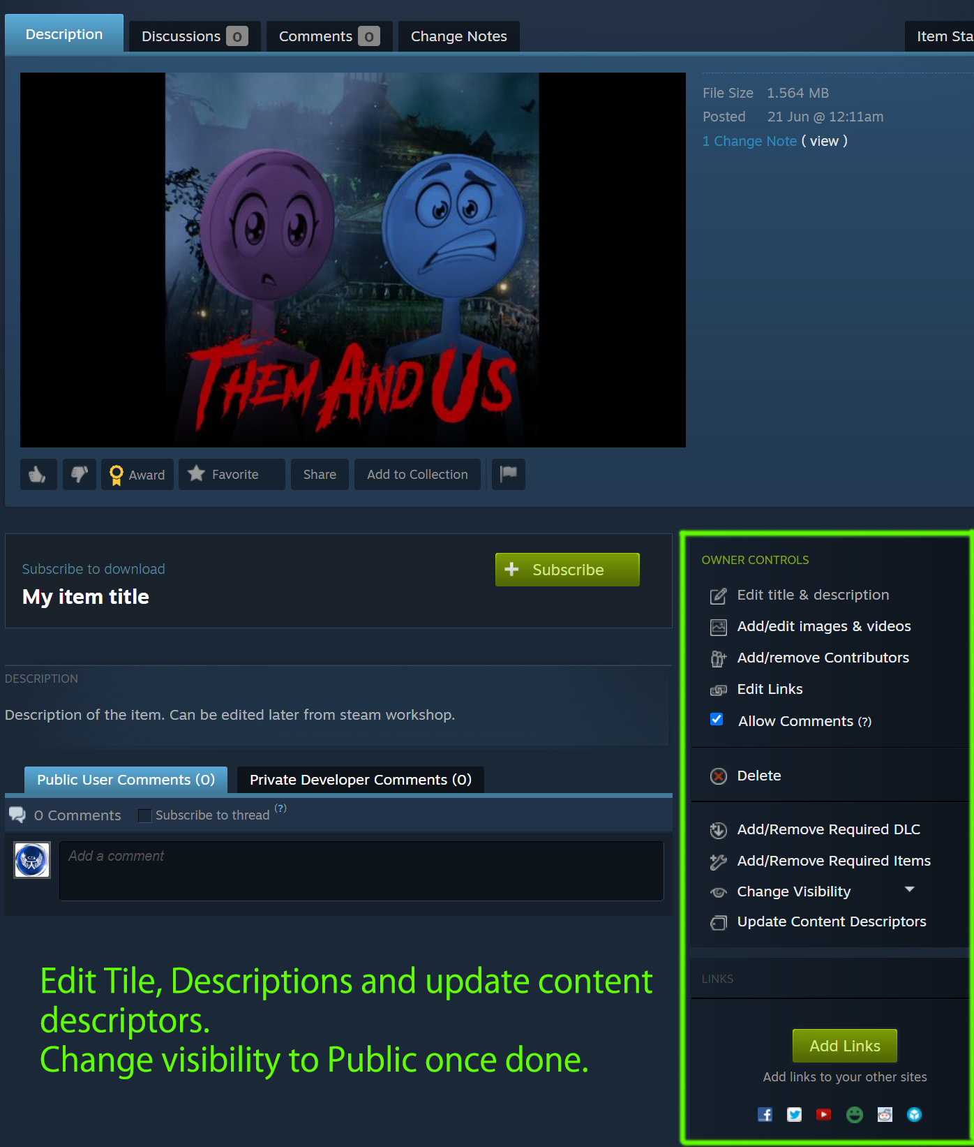 Once your character is uploaded to STEAM Workshop you can edit everything inside the steam workshop interface. That includes: